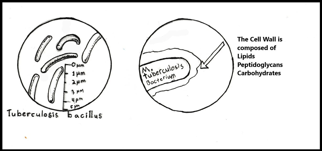 M. Tuberculosis is a rod-shaped bacterium. It is 2-4 micrometers (uM) and 0.2-0.5 uM in width. This is much smaller than the cells of the human body. A macrophage, the cell type M. tuberculosis initially infects, is typically 21 uM across. The bacterium requires oxygen to replicate and cannot move on its own. It is well suited to the environment of the human lungs which provide oxygen and can cough and expel the bacteria into the air. M. Tuberculosis is notable among bacteria for two reasons: it’s incredibly resilient cell wall and its lengthy division. Bacteria, like eukaryotes (you, me, the bees, the trees) have a plasma membrane composed of a phospholipid bilayer. This is the membrane that contains the cell and all its components. Some bacteria create another wall outside of the phospholipid bilayer called the cell wall. M. Tuberculosis possesses an elaborate and unique cell wall. It is, like most bacterial cell walls, made up of fats, proteins, and sugars. The wall is mostly composed of complex lipids (fats), but it also has peptidoglycan (sugars connected to proteins) and polysaccharides (complex carbohydrates) that dictate the structure and viability of the cell. The cell wall and the structures on it are how the bacteria interacts with the world around it. The second notable aspect of M. Tuberculosis is that it takes 12-20 hours to replicate. This is ten times longer than most other bacteria; E. coli can replicate once every twenty minutes. This seemingly simple aspect provides another defense against treatment by shortening the window in which antibiotics can attack.